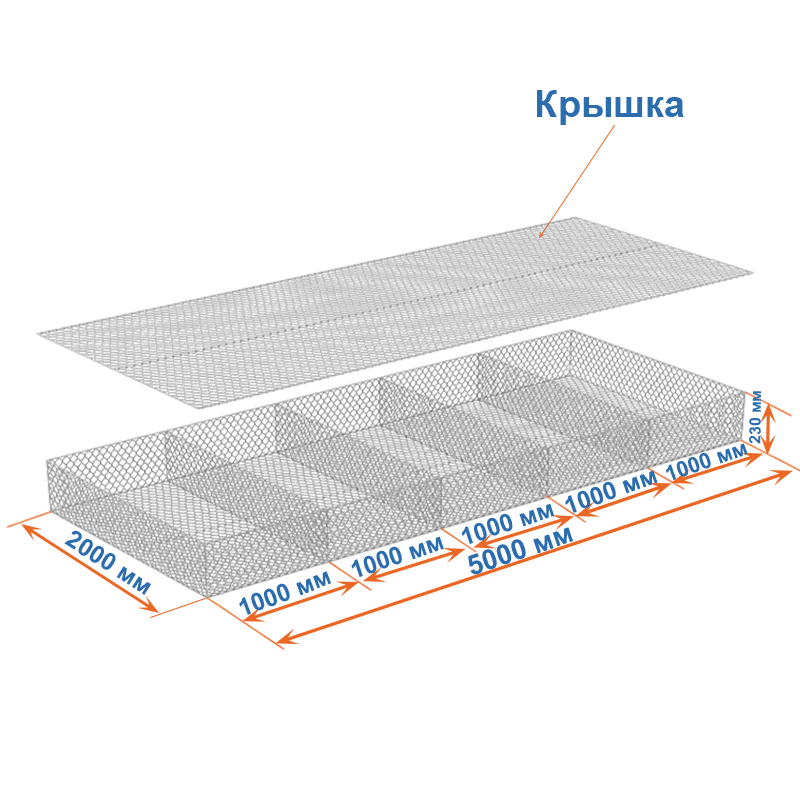 Габион матрац ГСИ-М 5х2х0,23 оцинкованный, Ø проволоки 2,2 мм, размер ячейки 6х8 см